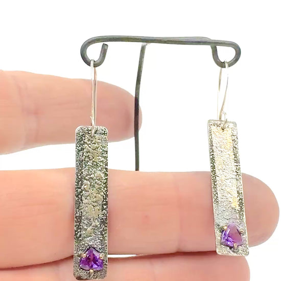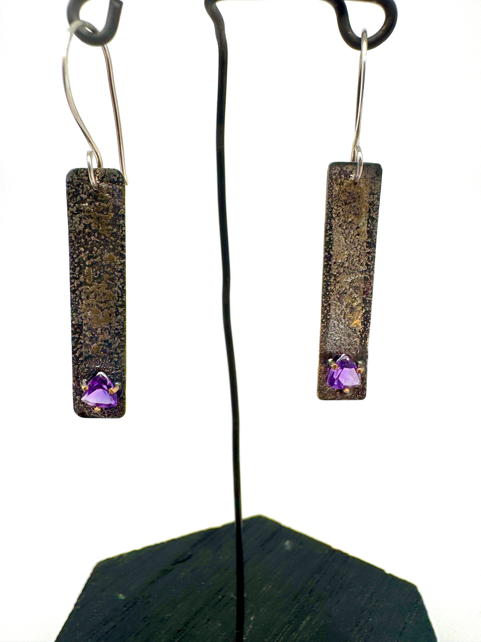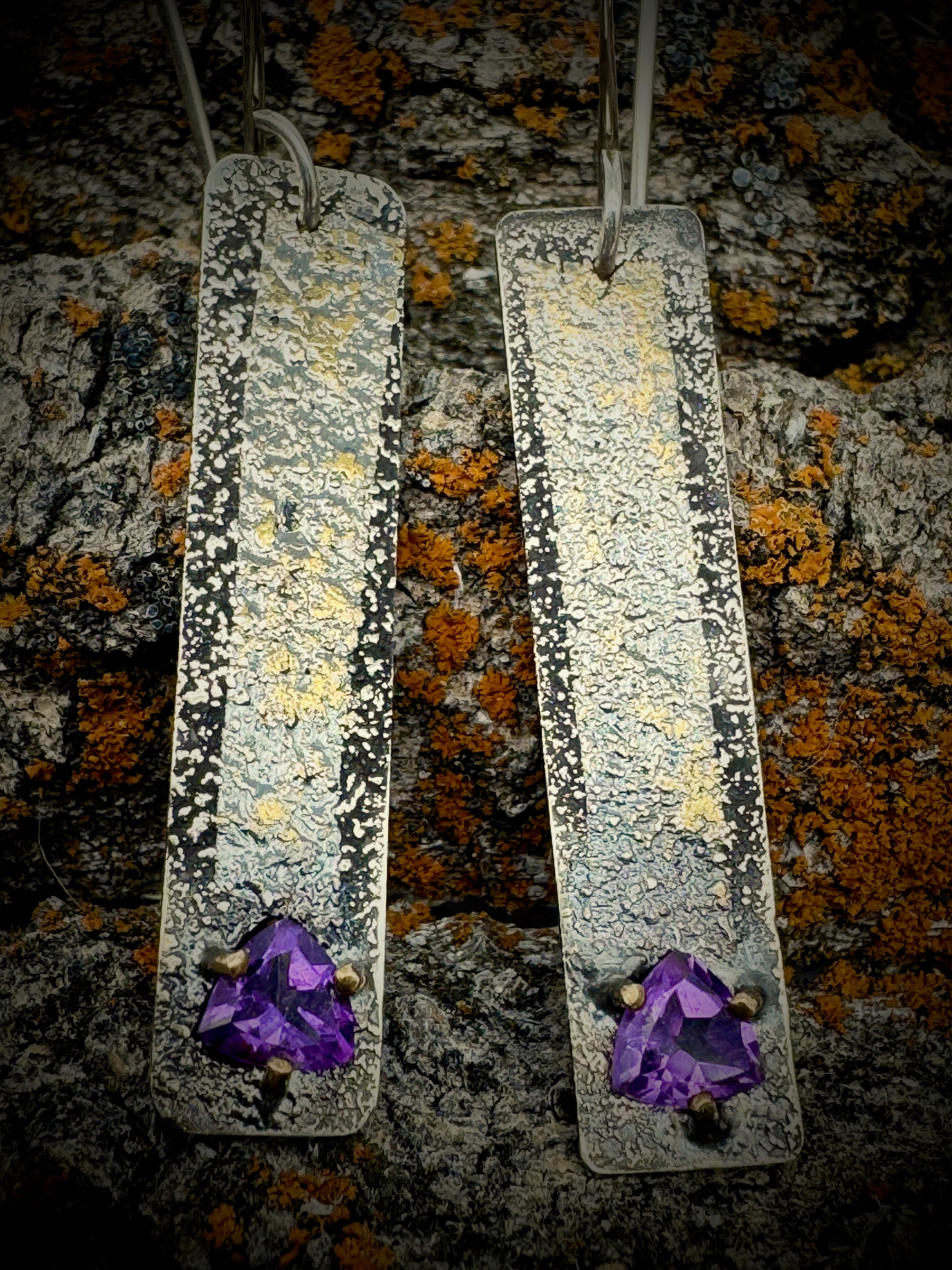 These lightweight earrings are hand made with sterling silver and inlaid with 23k gold using the Kuemboo method*, with 5mm amethysts prong set into them