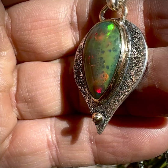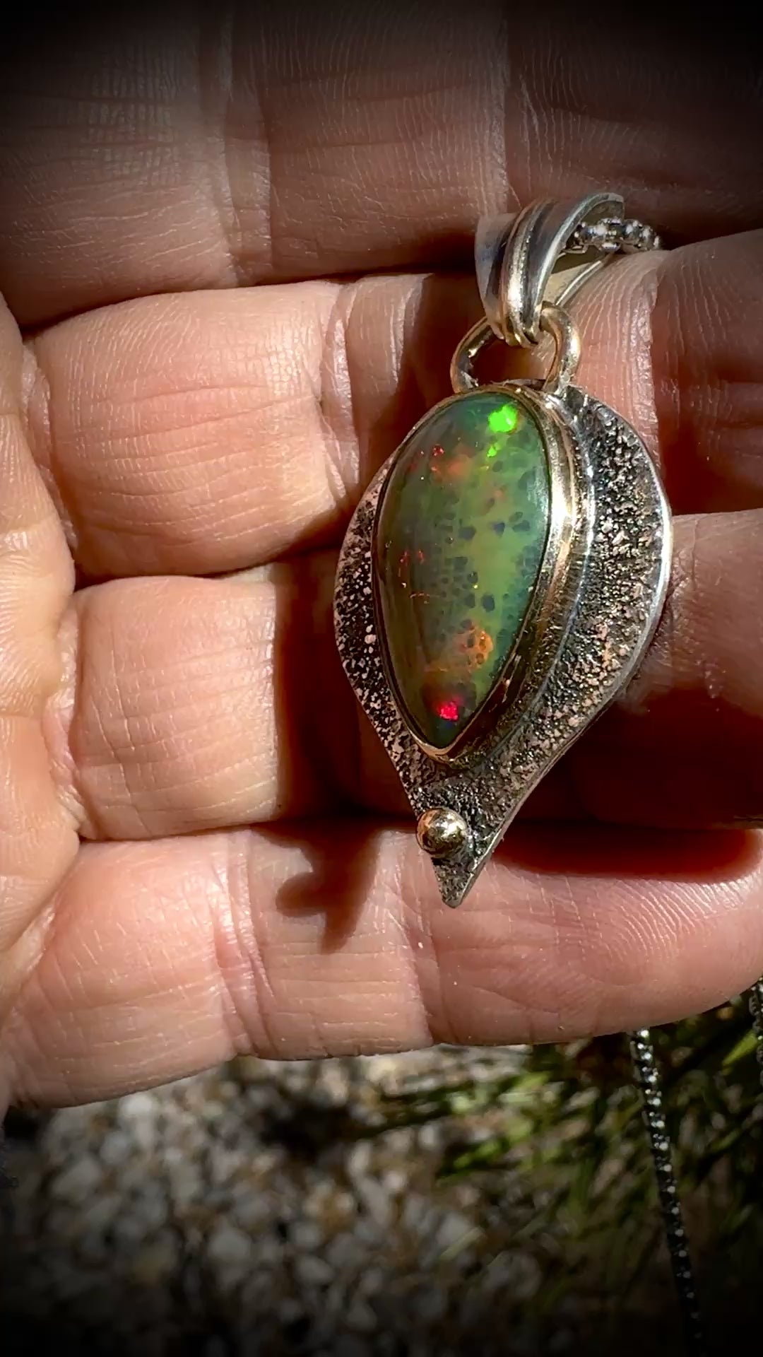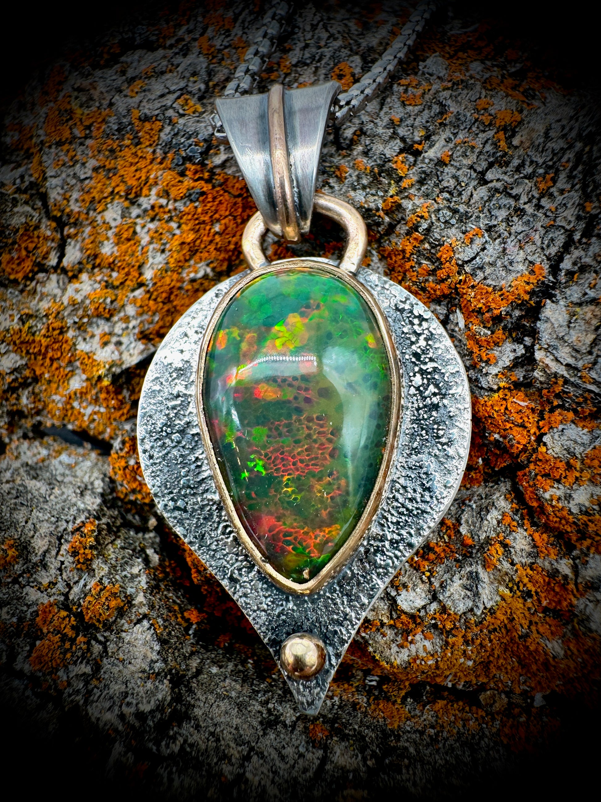 11ct Honeycomb opal set in 14k gold fill on dust fused sterling silver with 14k gold and gold fill accents. Pendant is approx 35mm x 42mm not counting bail. This is my favorite one of these I've made thus far! <3