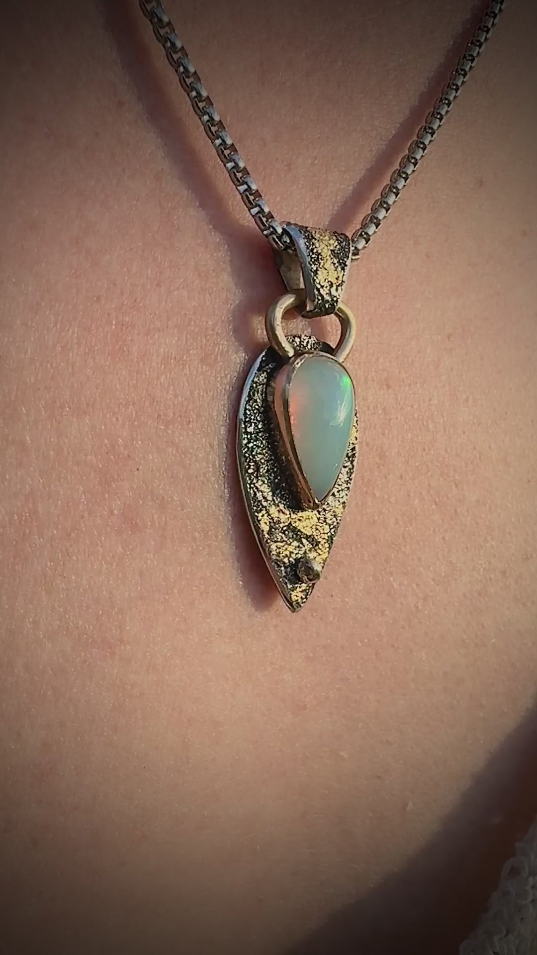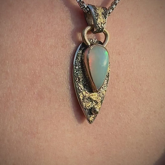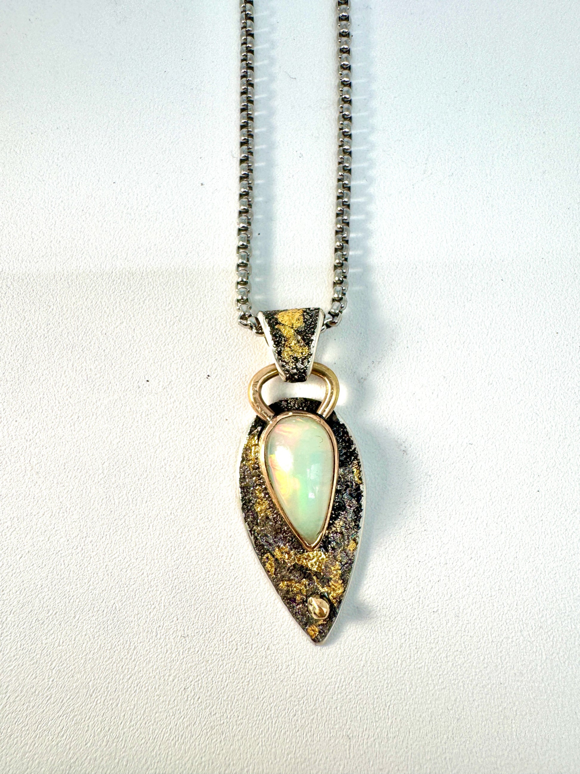 this gorgeous untreated opal is set in 14k gold fill with 24k gold fused using the kuemboo technique onto fused and dusted antiqued sterling silver, with a dollop of 14k gold added for good measure. Approx 30 x 20 mm not including bail