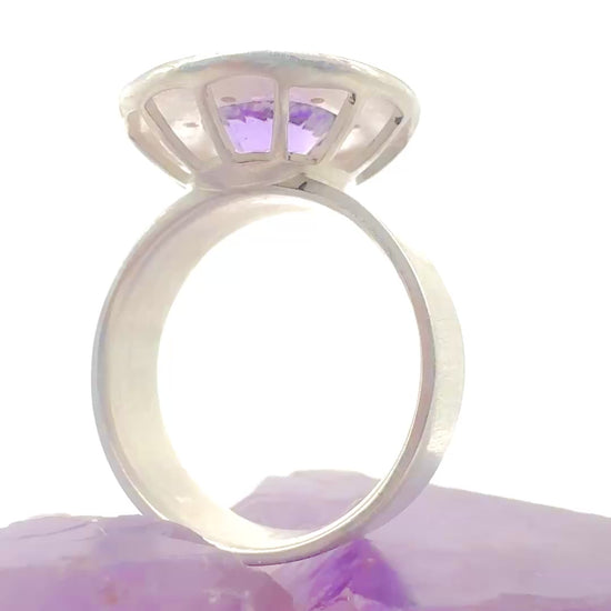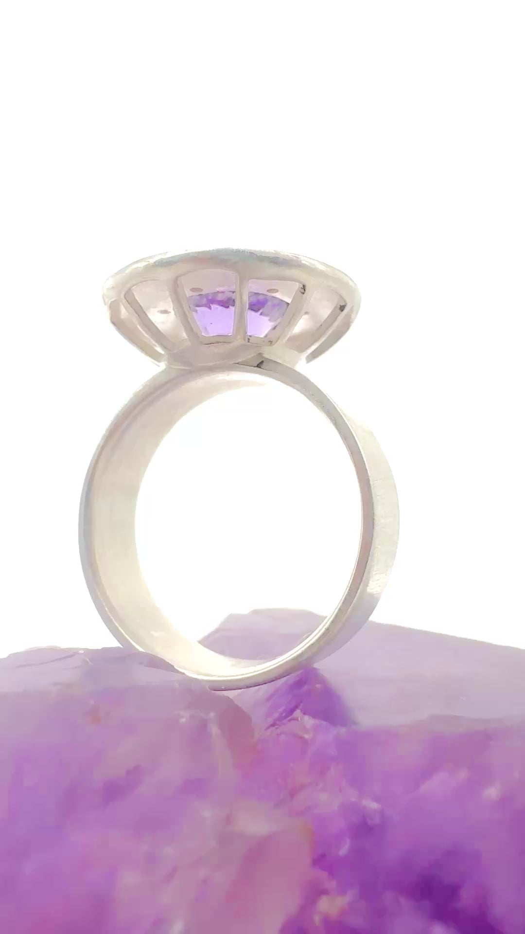 Beauty is in the Eye of the Beholder, a luscious 9mm amethyst set in 14k gold fill prongs on textured and hand cut sterling silver. Size 8. One of a kind, will likely not be duplicated as it was not nearly as straightforward as I was hoping to make it be...