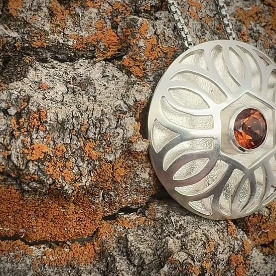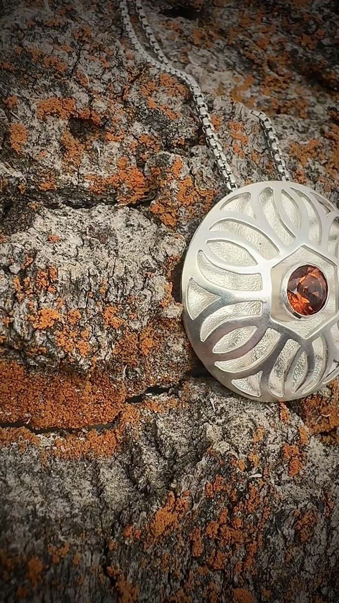 Beauty is in the Eye of the Beholder, and also in this 55mm pendant featuring a 7mm Madeira citrine set in hand cut, forged and textured sterling steel pendant. On an adjustable 18-20 inch chain.
