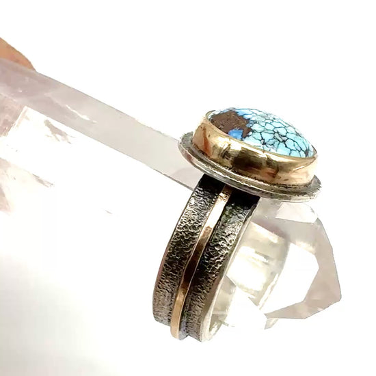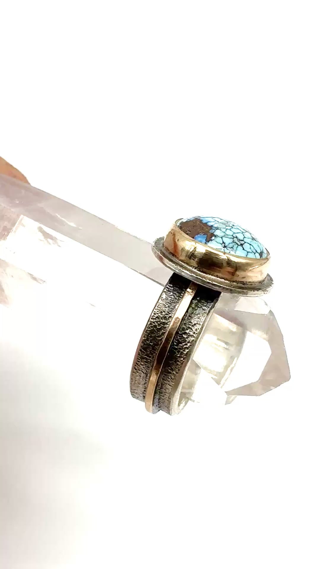 Set in 14 k gold fill and an antiqued and distressed sterling silver band with 14k gold fill applique. Size 7