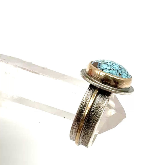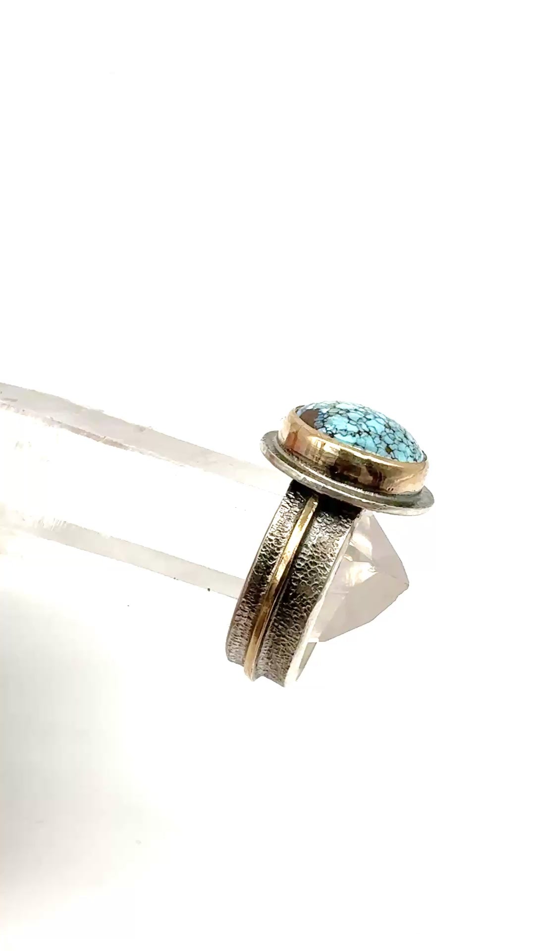 Set in 14 k gold fill and an antiqued and distressed sterling silver band with 14k gold fill applique. Size 7