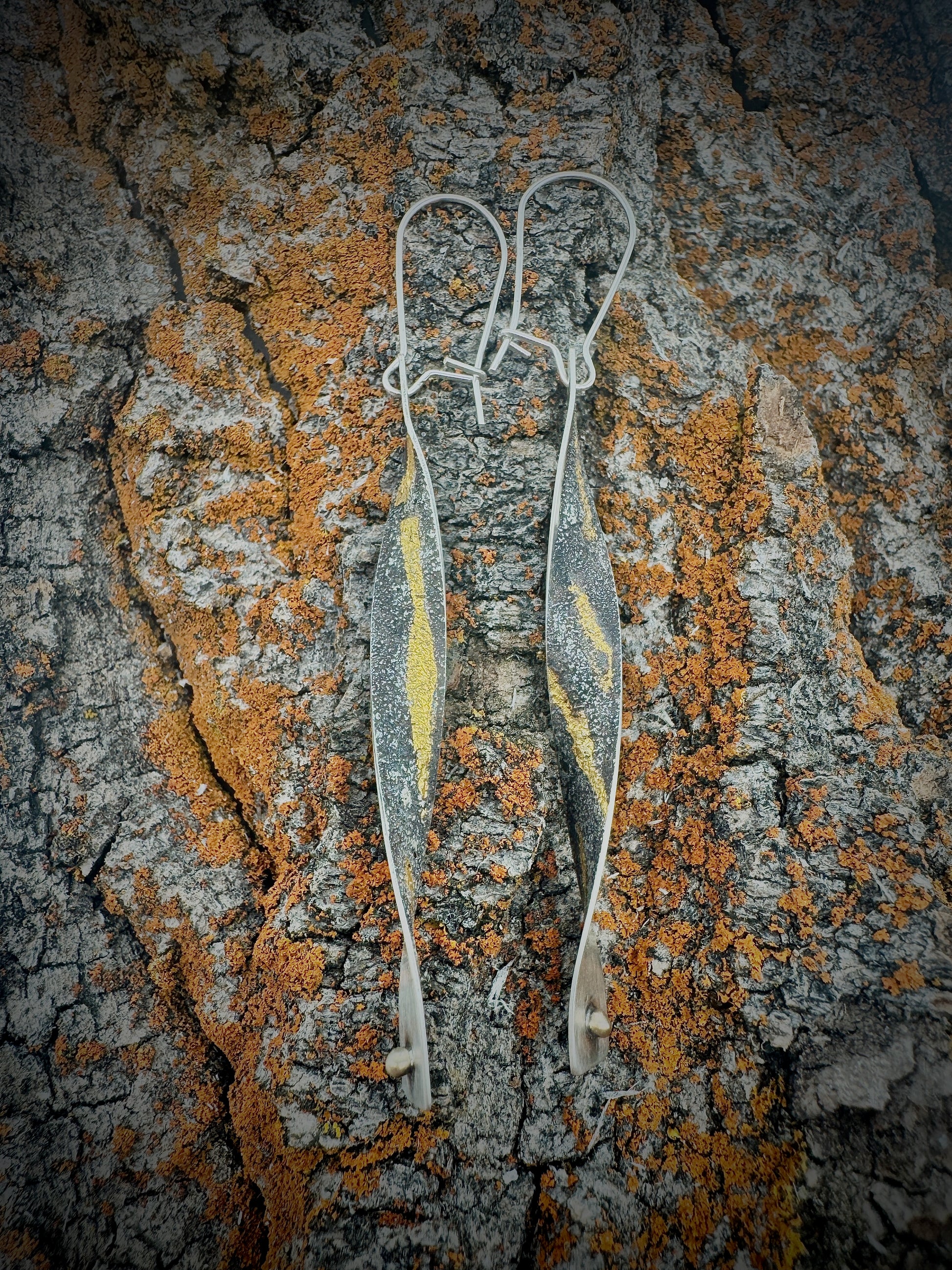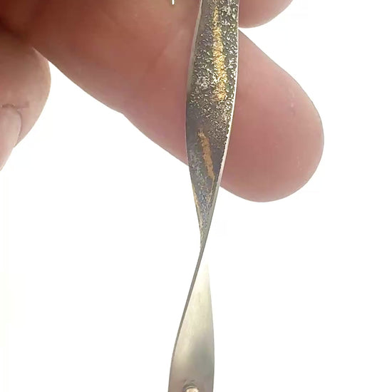 These lightweight Golden Twist earrings are made of twisted sterling silver that has fused silver dust and fused 24k gold on one face, and is satin brushed with a drop of 14k gold on the other face. Can be worn so there's more texture, or more satin, facing out to the world.