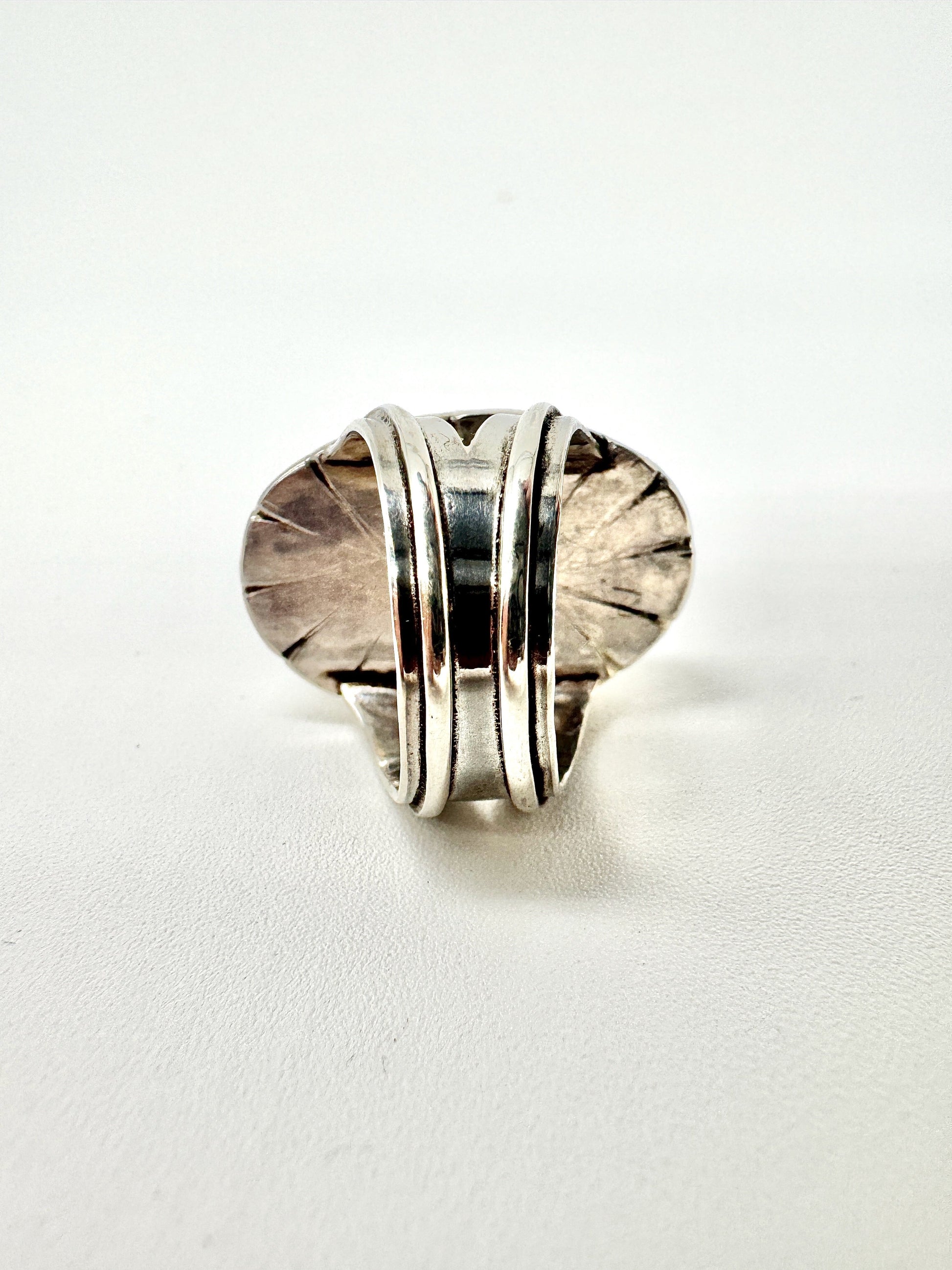 this Kingman composite turquoise and bronze stone is set in a castellated sterling silver bezel on a wide split sterling silver band, size 6.5