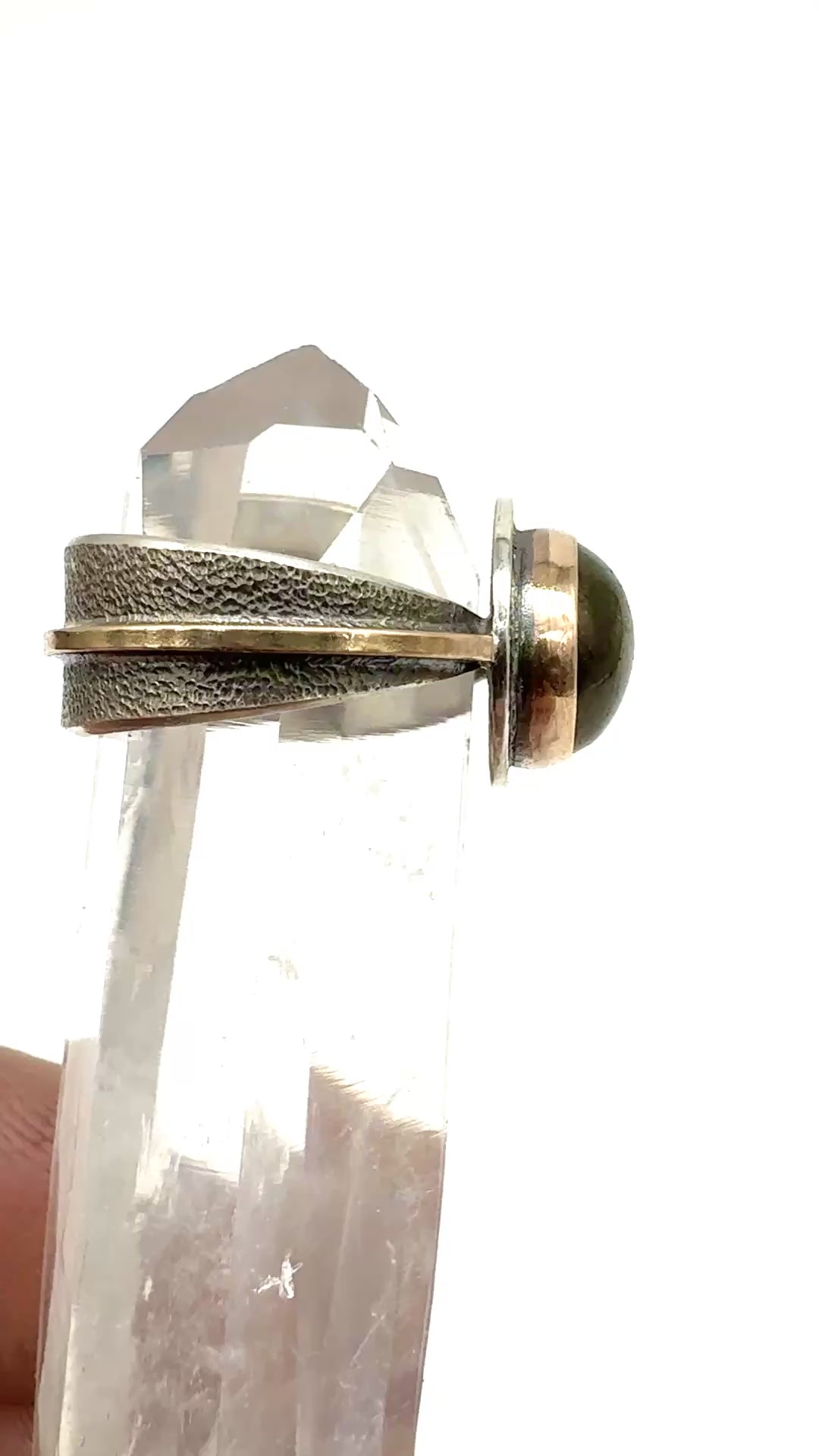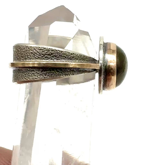a 10mm Labradorite set into a 14k gold fill on sterling silver reverse band ring with 14k gold fill accents, size 7