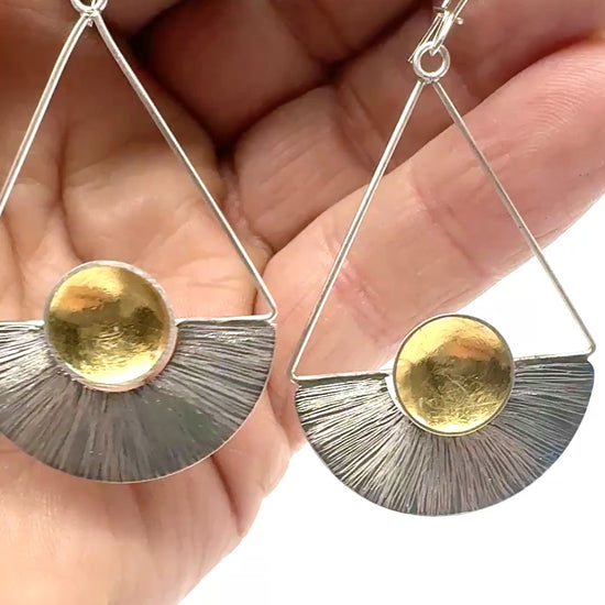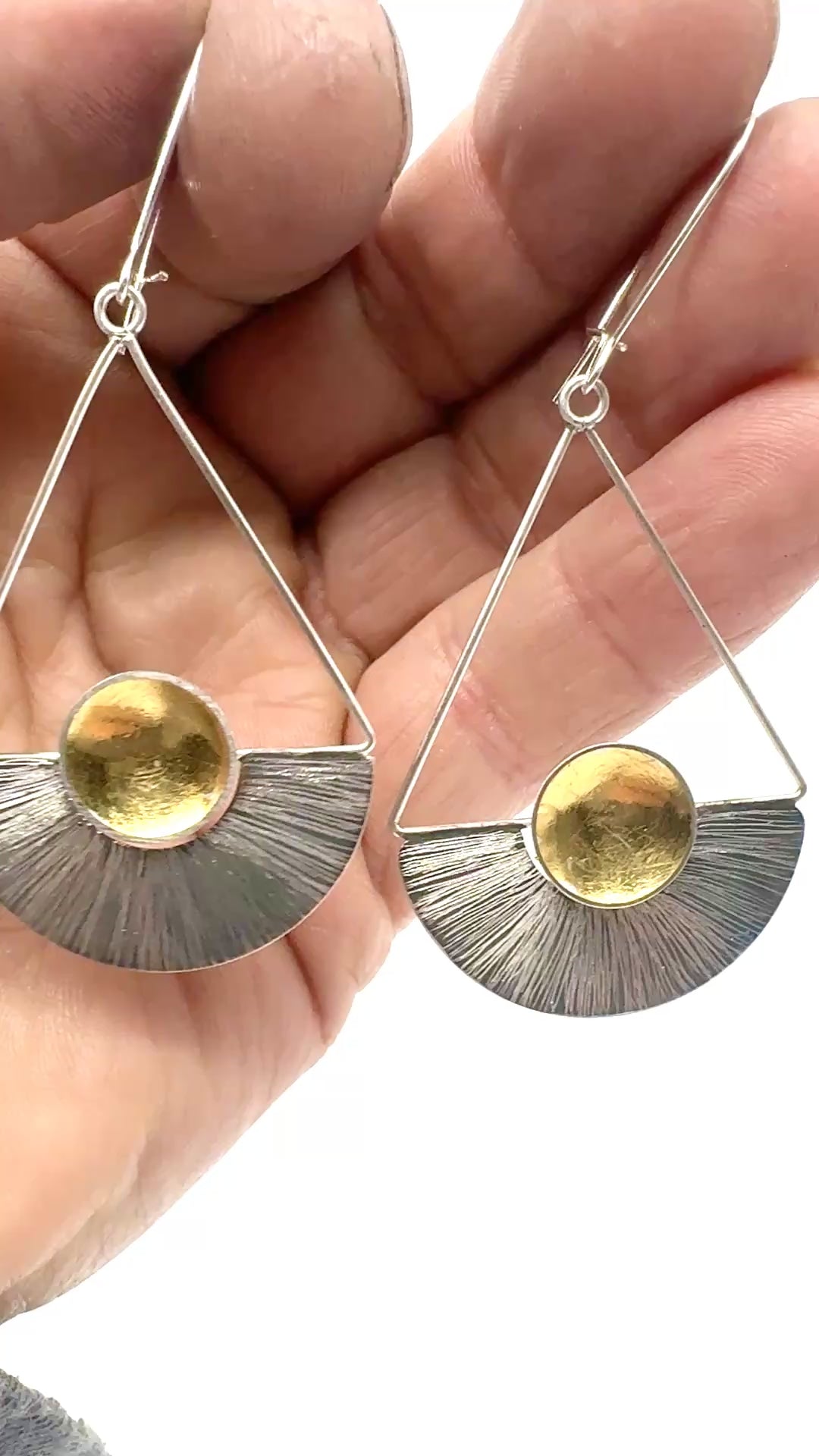 These new lightweight and classy dangling LifeStar earrings are hand made with sterling silver and inlaid with 23.5k gold using the Kuemboo method*, set into the domes with antiqued and hand etched outside rays.