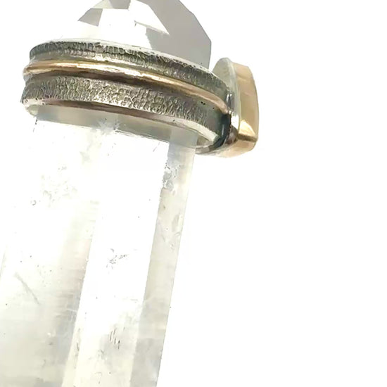 Gorgeous matte black Obsidian set in 14/20 gold filled setting on a textured sterling silver ring. I love the contrast of the shiny gold and the matte black stone.