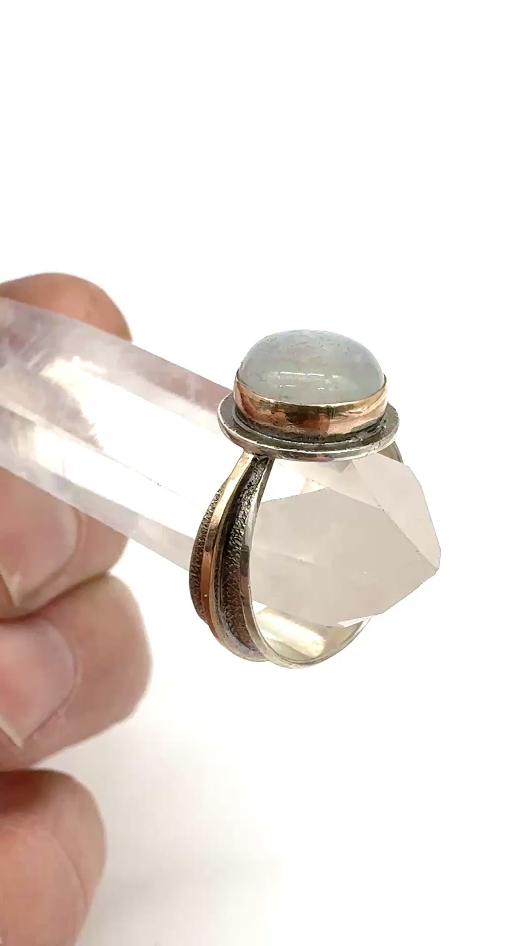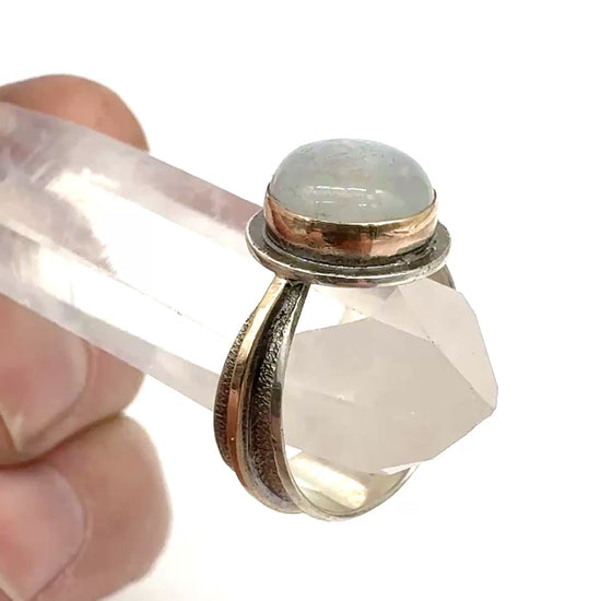 a 10mm rainbow moonstone set into a 14k gold fill on sterling silver reverse band ring with 14k gold fill accents, size 7