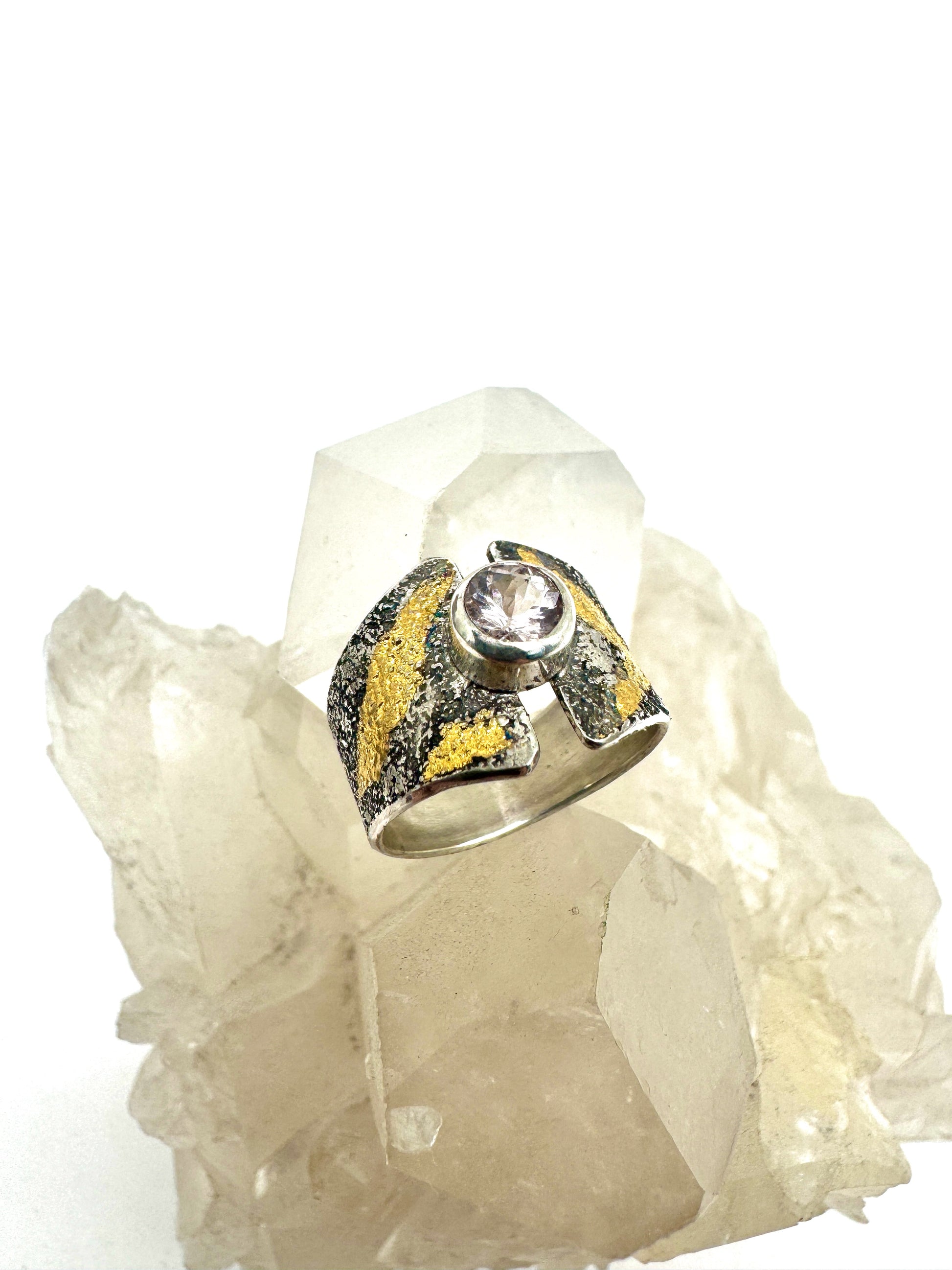a luscious pastel pink Morganite set in a textured and antiqued sterling silver butterfly band with fused 24k gold, size 5.5
