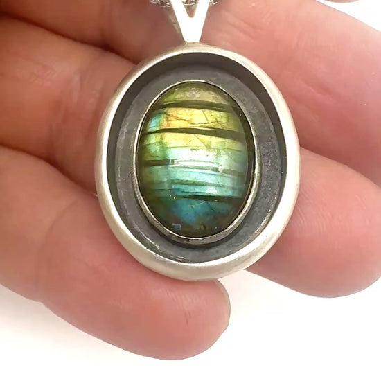 14x18mm Northern lights labradorite set in sterling silver shadowbox pendant with satin finish. 28x24mm not counting bail. Comes on 20 inch chain. Shown here with the Purple labradorite pendant