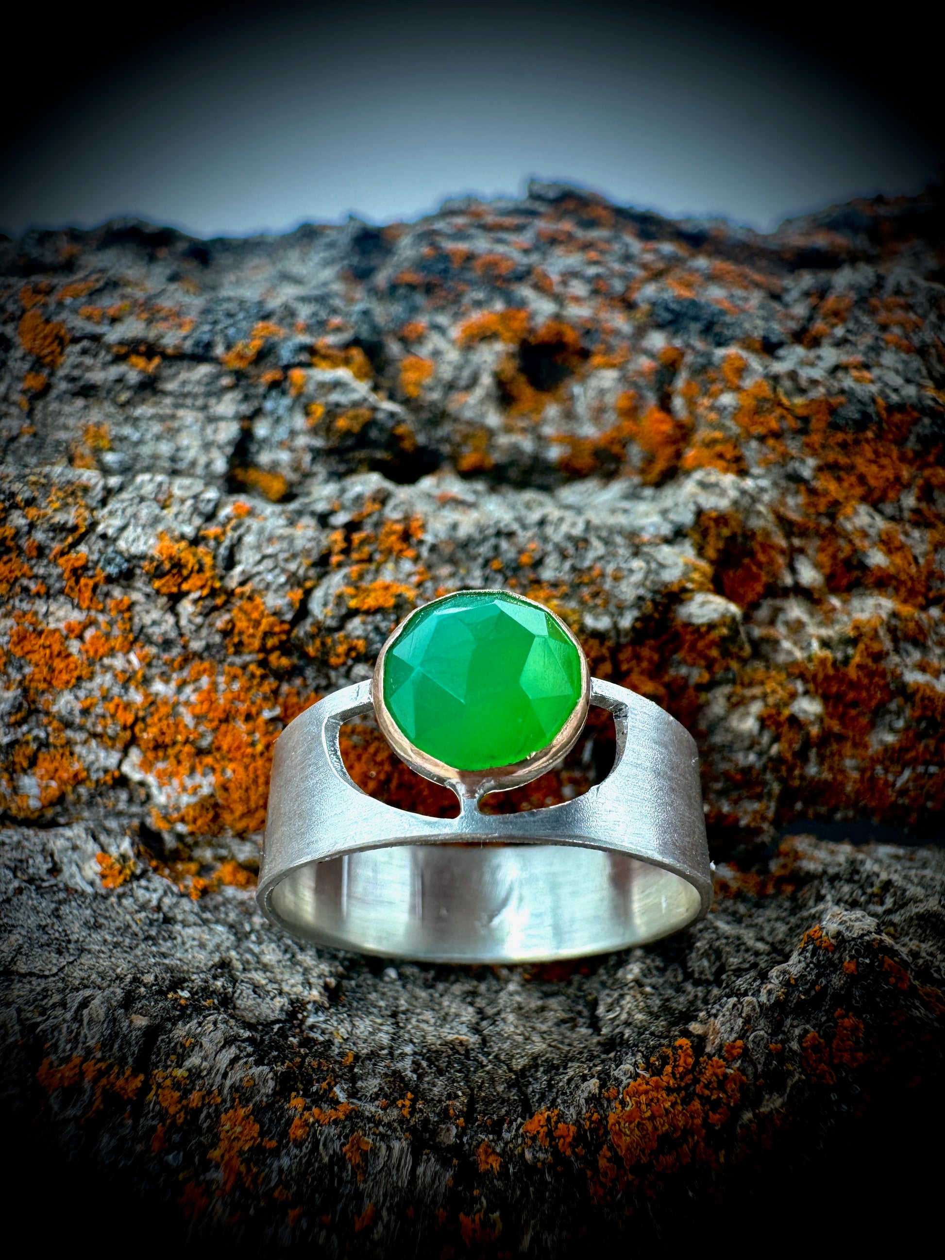 Offset 8mm Chrysoprase set in 14k gold fill on an offset satin finished sterling silver band, size 7
