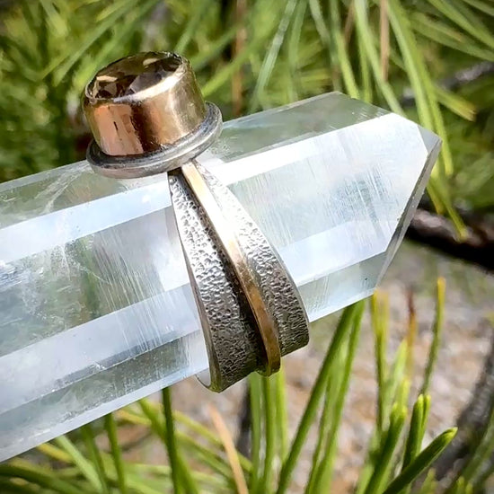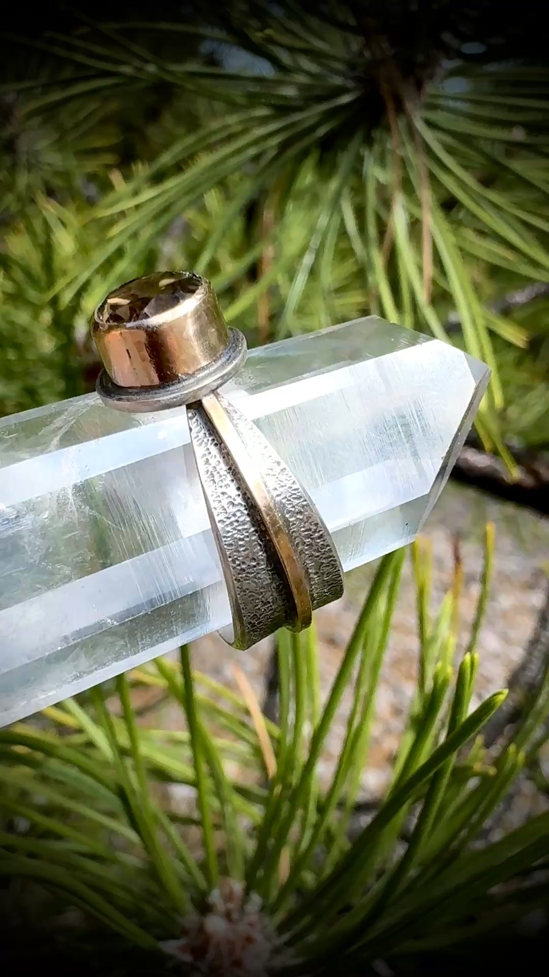 8x12 smoky quartz set in 14k gold fill on textured and antiqued sterling silver with 14k gold fill applique size 8