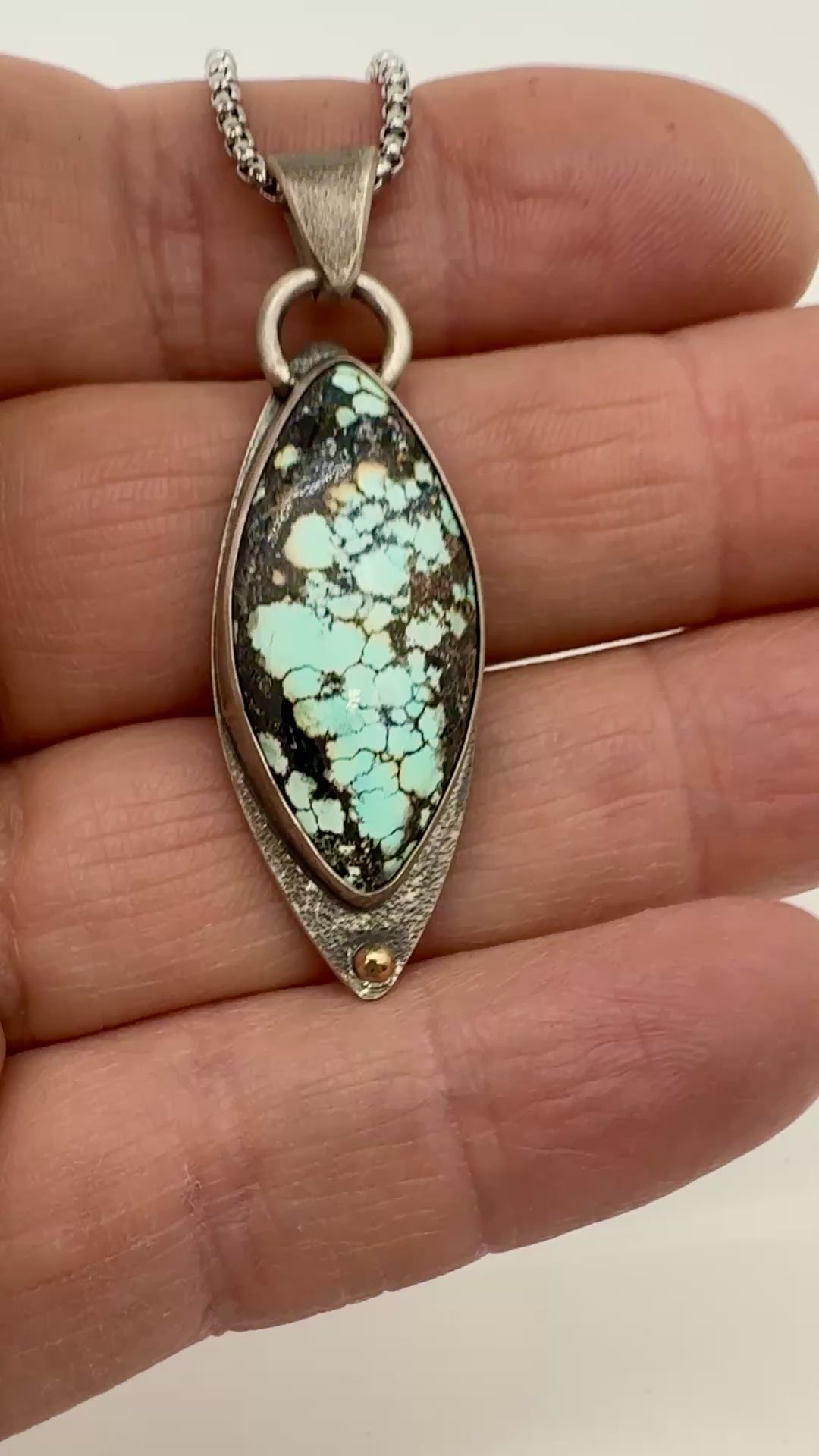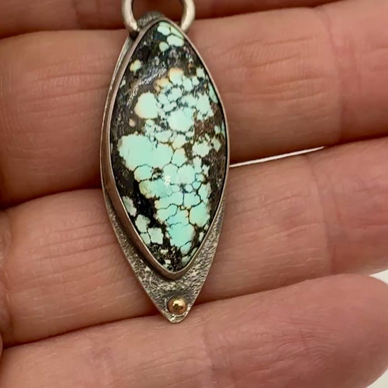 15x31mm Hubei turquoise set in sterling silver with textured backing and 14k gold accent. 16mm x 37mm not counting bail.