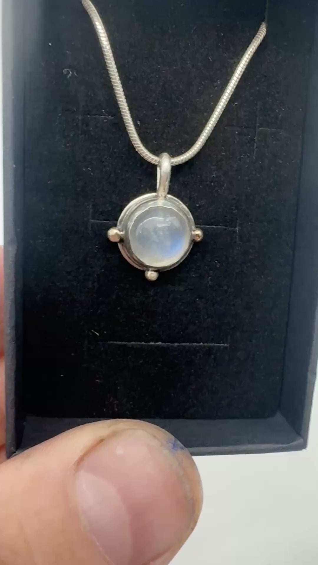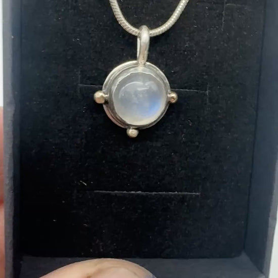 High grade 10mm Rainbow Moonstone set in sterling silver with 14k gold drops at the compass point. Pendant is a dainty 15mm x 15mm not counting the bail.