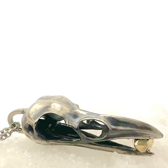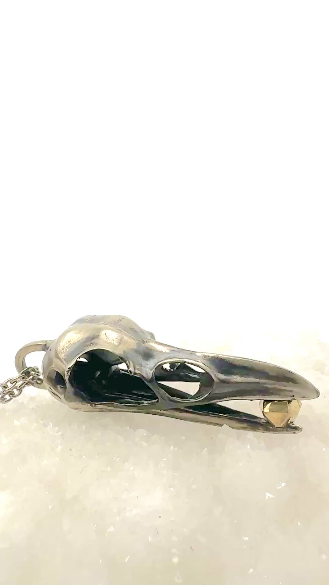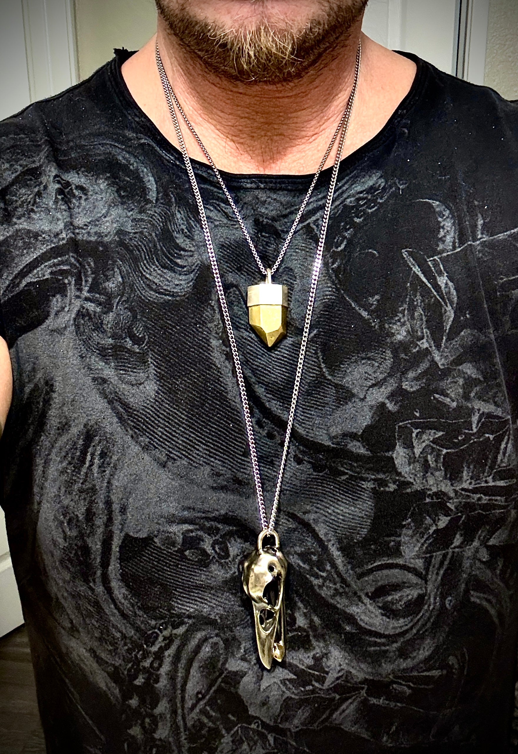 This hand carved and cast old crow skull is clutching a golden crystal gem in its mouth, a reminder that we all hold onto things, and ain't none of them coming with us in the end...Comes on a 30 inch chain, perfect for layering. Made of white brass and golden jewelers brass, with a stainless steel chain.